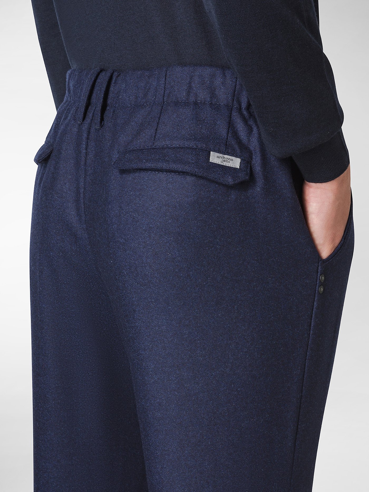 Toto'è il pantalone jogging di ultima generazione Archivio Jam: coulisse in vita, elastico sulla retrocinta, una pince fondo slim, tasche frontali stondate, tasche posteriori con pattina. Per questo modello associamo tessuti tecnici giapponesi ad alto contenuto per comfort ed innovazione derivante dal mondo dell'activewear. La trasversalità che può offire il pantalone Toto' è di indubbia valenza, abbinabile nel tempo libero piuttosto che nello smart working o in ufficio, magari raggiungendolo in e-bike. Le confezioni di questi capi sono rigorosamente made in Veneto compresi accessori e stile.